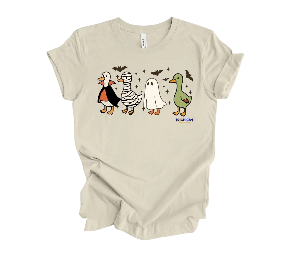 Get into the spirit of Spooky season with this original ducks designs. ORDERS DELIVER IN TWO WEEKS APPROXIMATELY. IF IN STOCK WILL DELIVER BY HALLOWEEN. WE WILL KEEP YOU POSTED.This classic unisex jersey short sleeve tee fits like a well-loved favorite. Soft cotton and quality print make users fall in love with it over and over again. These t-shirts have-ribbed knit collars to bolster shaping. The shoulders have taping for better fit over time. Dual side seams hold the garment’s shape for longer.100% Airlume combed and ringspun cotton (fiber content may vary for different colors)Light fabric (4.2 oz/yd² (142 g/m²))Retail fitTear away labelRuns true to size