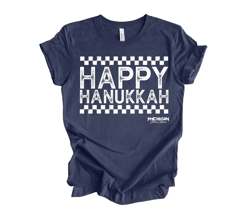Enjoy the Hanakkuh Season this year with our Happy Hanakkuh Tee.This classic unisex jersey short sleeve tee fits like a well-loved favorite. Soft cotton and quality print make users fall in love with it over and over again. These t-shirts have-ribbed knit collars to bolster shaping. The shoulders have taping for better fit over time. Dual side seams hold the garment’s shape for longer.100% Airlume combed and ringspun cotton (fiber content may vary for different colors)Light fabric (4.2 oz/yd² (142 g/m²))Retail fitTear away labelNOT PRESHRUNK